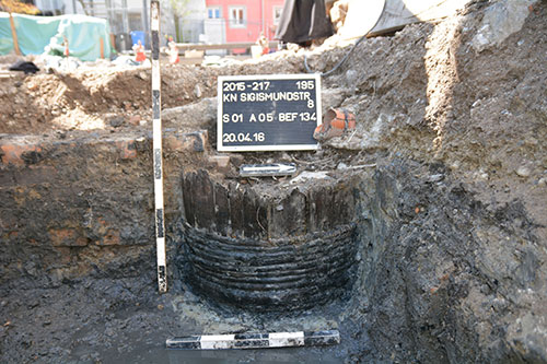 Die archäologische Ausgrabung lieferte nun als typische Elemente für Hinterhofbereiche Befunde zur Entsorgung. Die dokumentierten Latrinen wurden sowohl in solider rechteckiger Bauweise ausgeführt, als auch in Form von eingegrabenen Holzfässern (Abb. 1). Darüber hinaus konnten auch Spuren von handwerklichen Tätigkeiten nachgewiesen werden, wie eine Bronzegussgrube mit darin entsorgten Gussmodeln zeigt.