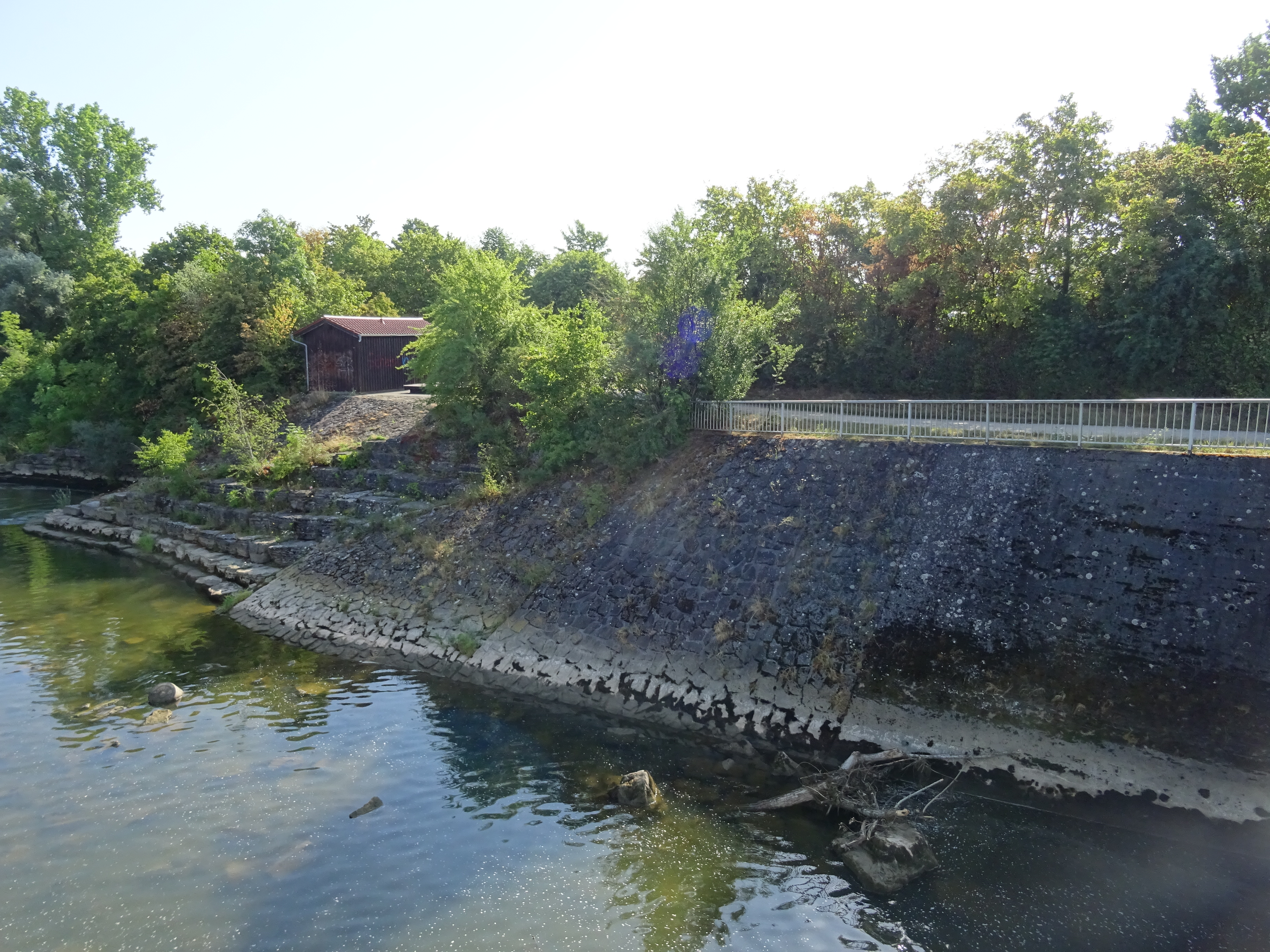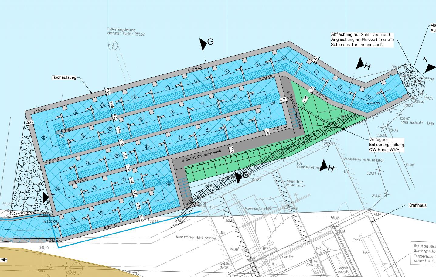 Dazu parallel Einschnitt ins Wehr und Bau Fischabstieg; die zu überwindende Höhe beträgt etwa vier Meter.