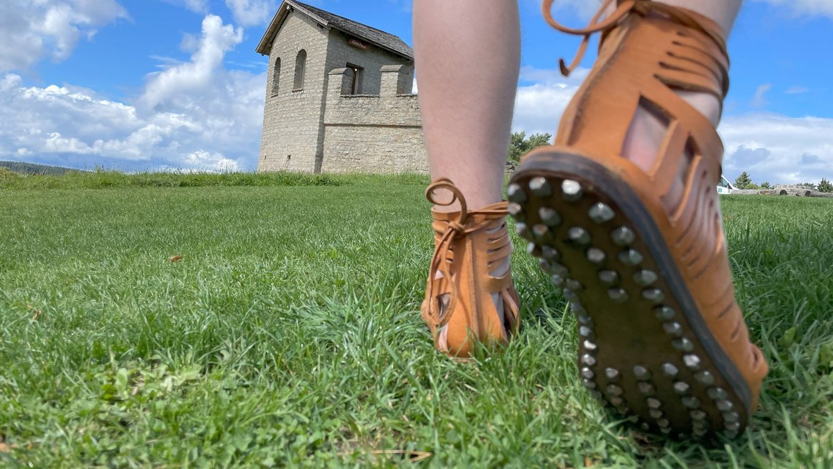 Römischer Soldatenstiefel (lateinisch: caliga) mit genagelter Sohle. Im Hintergrund der 1975 nachgebaute Eckturm des Kastells Waldmössingen