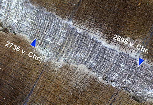Ein Eichenholz aus der Steinzeit. Für die Jahrringanalyse präparierte Messstrecke, Pfeile zeigen die Ringe der jeweiligen Jahre. (Quelle: Landesamt für Denkmalpflege im Regierungspräsidium Stuttgart, O. Nelle)