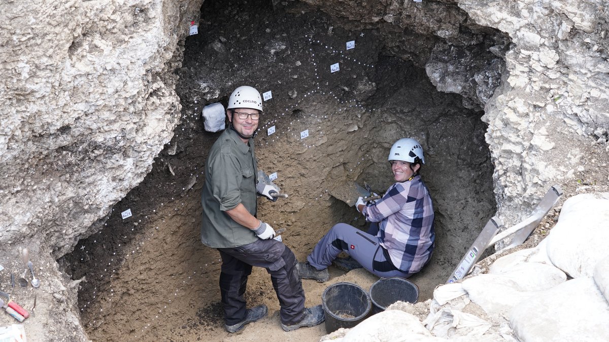 „Ein solcher Fund ist in der Altsteinzeitforschung äußerst selten und bietet die Möglichkeit, wichtige Fragen zum Verhalten späteiszeitlicher Jäger und Sammler mit modernen Methoden und nur minimalen Bodeneingriffen zu beantworten“, erläuterte Dr. Yvonne Tafelmaier. In diesem Jahr wurde die Sedimentabfolge am Eingang, die für die Archäologinnen und Archäologen ein wichtiges Kultur- und Umweltarchiv darstellt, dokumentiert und beprobt. Neben wenigen eiszeitlichen Steinwerkzeugen fanden sich vor allem Tierknochenreste.
