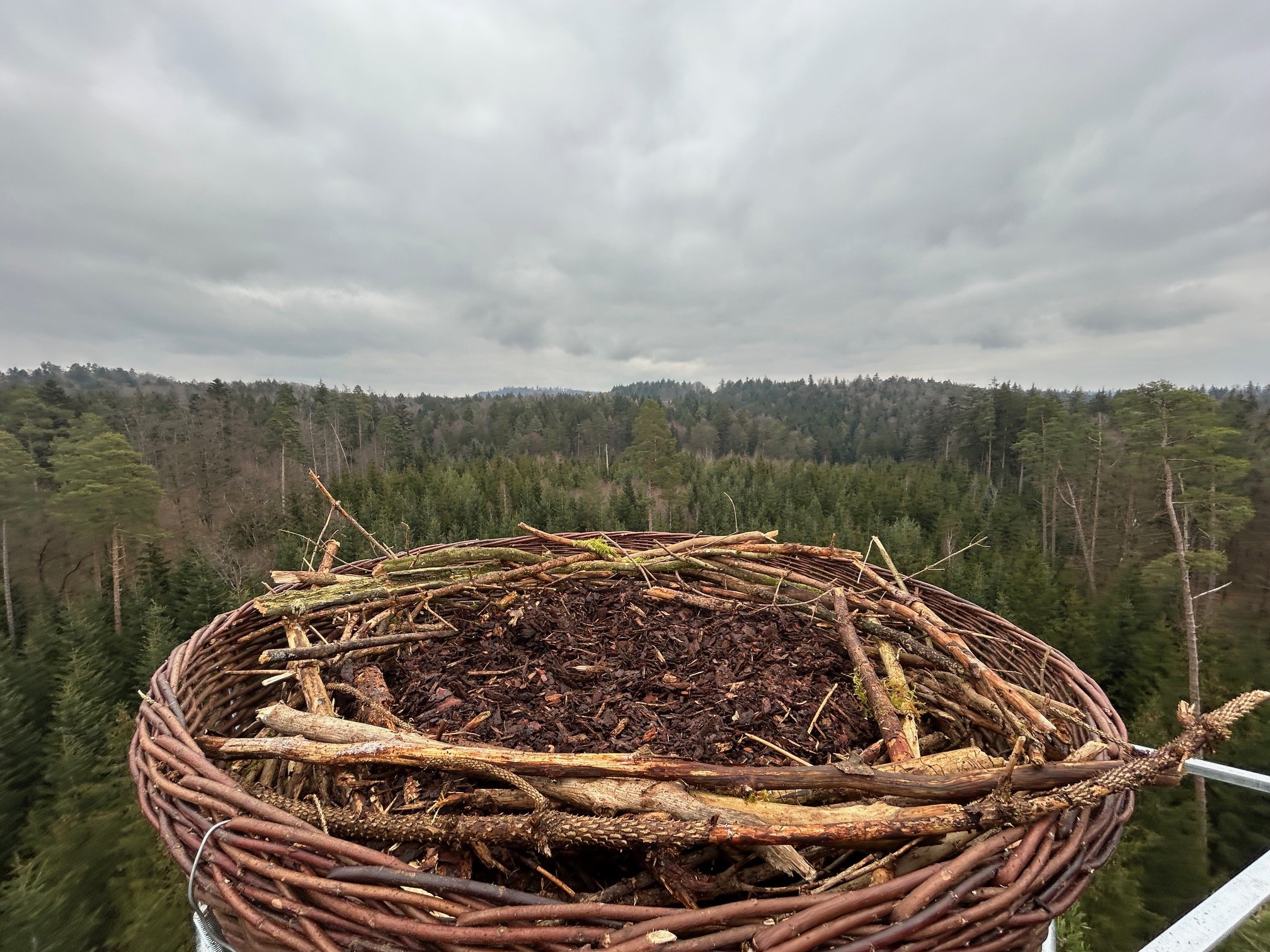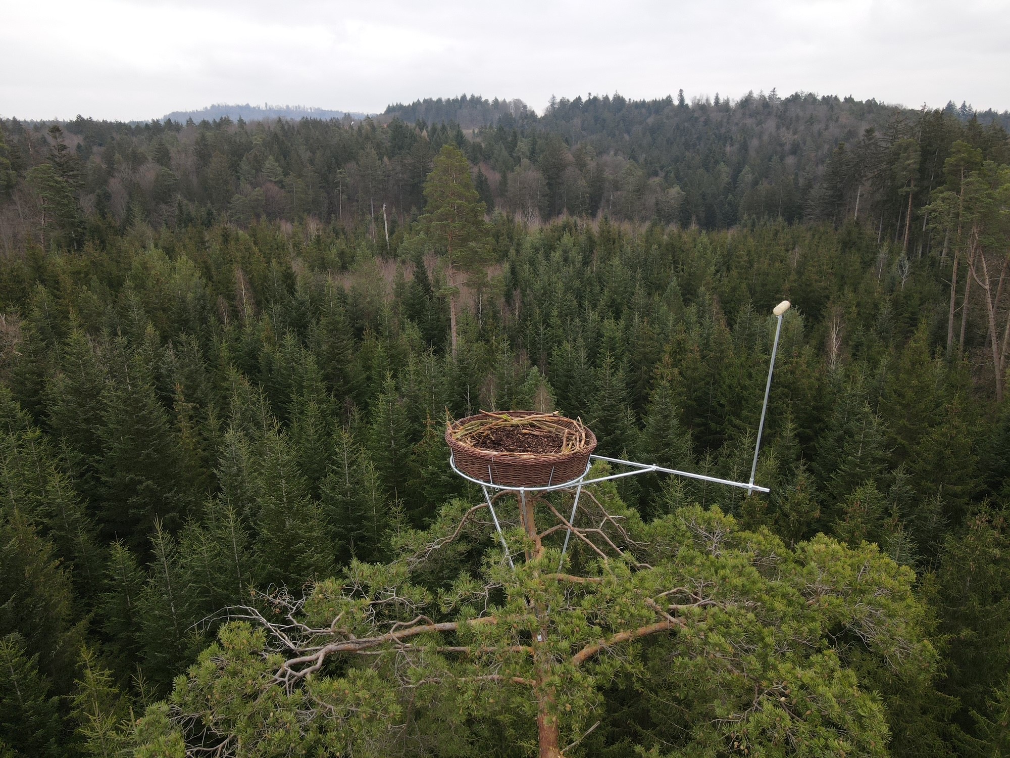 Hierfür musste die gut 1,2 Meter große Nestplattform samt Stahlunterkonstruktion, Verankerung und Nistmaterial aufwendig in die Krone einer rund 25 Meter hohen Kiefer befördert werden. Die anschließende komplizierte Befestigung der Plattform übernahm ein erfahrener Baumkletterer. Nach gut drei Stunden konnten die Arbeiten erfolgreich abgeschlossen werden. Dr. Daniel Schmidt-Rothmund, der sich seit vielen Jahren für den Schutz des Fischadlers einsetzt und bereits Nisthilfen an mehreren Standorten in Bayern baute, ist von der Artenschutzmaßnahme begeistert. Er ist zuversichtlich, dass sich in den nächsten Jahren ein Brutpaar ansiedeln könnte. „Das Timing ist perfekt! Mitte März treffen die ersten Durchzügler des Fischadlers in Deutschland ein, so dass die ersten Tiere schon jetzt die Möglichkeit haben, sich mit dem neuen Nest vertraut zu machen“, so Schmidt-Rothmund.