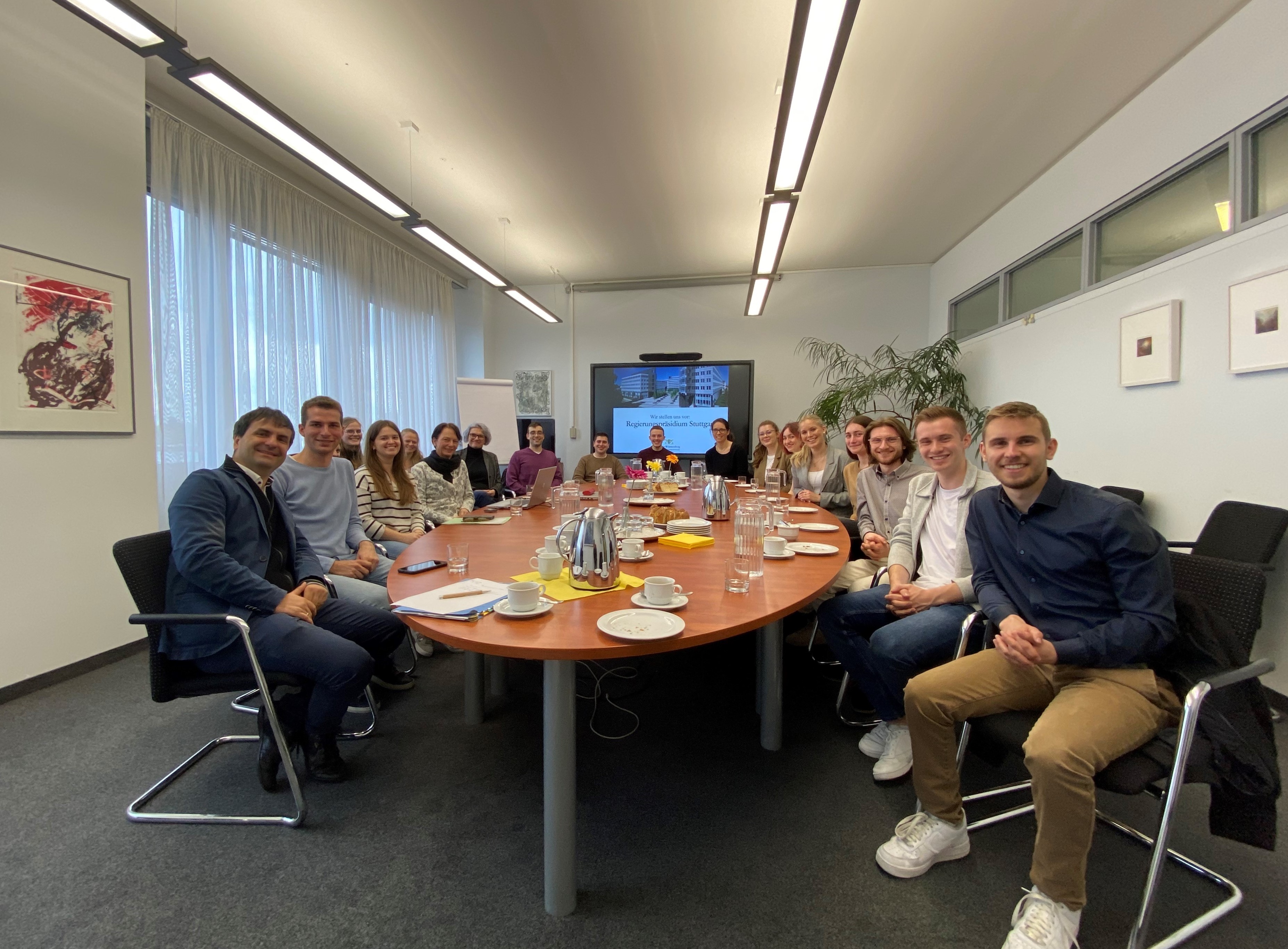 Nach einer wohlverdienten Mittagspause ging es für die Gruppe weiter zum Regierungspräsidium Stuttgart. Hier erwartete die Studierenden neben Kaffee und Kuchen ein einmaliger Einblick in die Rolle und Funktion einer Mittelbehörde. Regierungspräsidentin Susanne Bay ließ es sich nicht nehmen, die Studierenden persönlich zu begrüßen und mit ihnen ausführlich über die vielfältigen Aufgaben ihrer Behörde zu sprechen. Als zweitgrößte Mittelbehörde in Deutschland mit etwa 2.300 Mitarbeitenden kümmert sich das Regierungspräsidium vom Imissionsschutz bis zum Stadtumbau um eine große Themenpalette und trägt als Mittler zwischen Landesregierung und Ministerien, Landkreisen und Kommunen eine große Verantwortung. In der anschließenden Fragerunde wollten die Studierenden von Regierungspräsidentin Bay wissen, wie es ihr gelingt, so einen großen Apparat zu koordinieren und welche persönlichen Erfahrungen und Fähigkeiten ihr dabei helfen.
