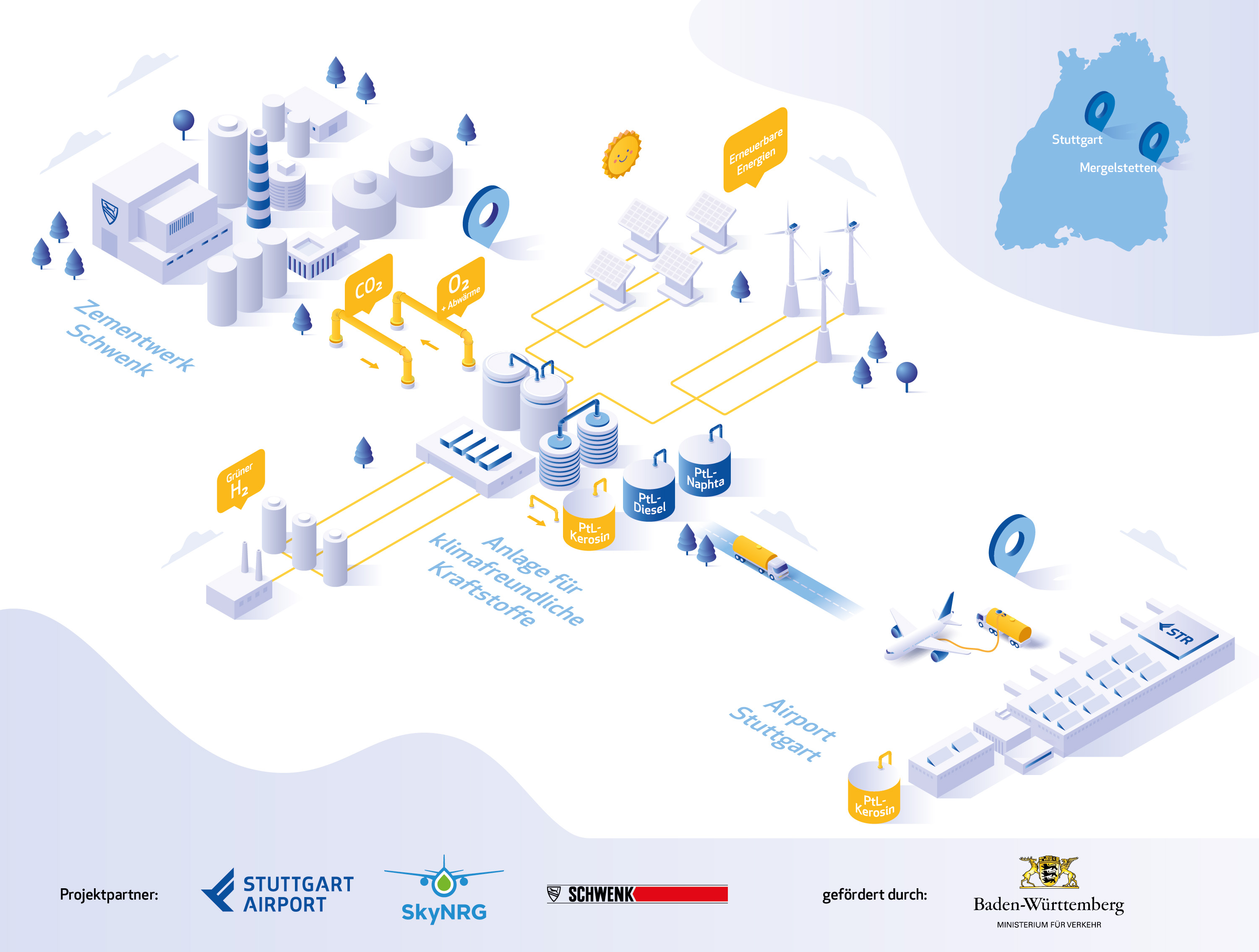 „Für die Zementwirtschaft ist das Projekt von enormer Bedeutung, da die sinnvolle Nutzung von Kohlendioxid aus der Abluft von Zementwerken als Rohstoff einen wichtigen Beitrag zum Klimaschutz darstellt“, so Thomas Spannagl, CEO von Schwenk. Hierzu solle auch die neuartige Technologie einer Oxyfuel-Anlage zur Zementherstellung in Baden-Württemberg von Schwenk errichtet werden. Heidenheim-Mergelstetten sei hierfür einer der favorisierten Standorte. Dabei kann das Kohlendioxid nahezu auf 100 Prozent in der Abluft konzentriert werden, um in der nachgeschalteten Anlage für nachhaltige Flugkraftstoffe unter Verwendung von Wasserstoff synthetisches Kerosin herzustellen.
